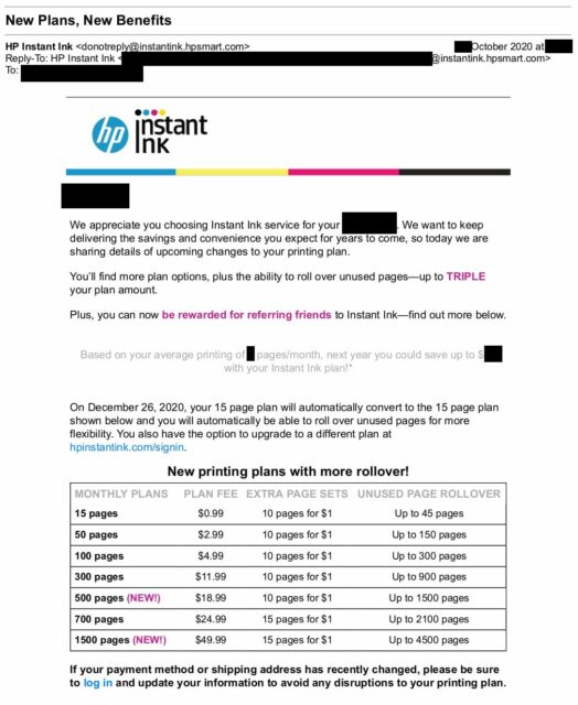 Il piano “Free Ink for Life” consentiva di stampare gratuitamente fino a 15 pagine al mese. Gli utenti dovevano pagare un extra solo se il numero di pagine era maggiore. A partire dal 26 dicembre, HP farà un “regalo di Natale”: anche chi stampa fino a 15 pagine dovrà pagare una quota mensile (0,99 dollari). Superato questo numero scatta l’extra di 1 dollaro per 10 pagine. Se il numero è inferiore è possibile recuperare le pagine non stampate nei mesi successivi.