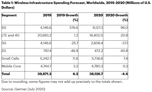Il boom dell’infrastruttura per il 5G compenserà, almeno in parte, la riduzione della spesa sulle reti di precedente generazione: le reti 4G e LTE scenderanno del -20,8%, il 3G del -37,1% e il 2G del -40,8%. Nel complesso, il 2020 vedrà una riduzione degli investimenti per le reti senza fili pari al -4,4%.