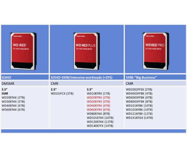 Il motivo del contendere è sempre l’utilizzo delle unità “azzoppate” (SMR) in configurazioni NAS, uno scenario in cui ora WD offrirà tre diverse proposte: gli HDD WD Red “lisci” useranno la tecnologia SMR e saranno consigliati per utilizzi “non intensivi”, i WD Red Plus saranno dischi a tecnologia convenzionale (CMR) per i NAS con carichi di lavoro intensivi e i WD Red Pro saranno indirizzati al settore business.