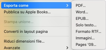 Scorri fino a “Esporta come”. Si aprirà un menu a tendina che, come mostrato qui sotto, chiede in che formato vuoi convertire il tuo file. La prima voce che trovi è proprio PDF. E non dovrai fare altro che cliccarci su.