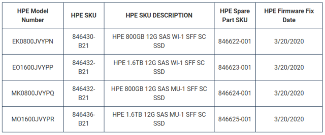 Hewlett Packard Enterprise (HPE) ha pubblicato un nuovo bollettino di supporto con tanto di firmware aggiornato, e l’invito pressante ai clienti ad aggiornare alcuni modelli di dischi SSD basati su standard SAS (Serial Attached SCSI) per evitare di ritrovarsi coi server “suicidati” e i dati irrecuperabili nel giro di qualche mese.