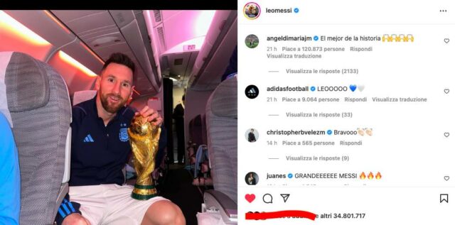 Circa 33,7 milioni di like per la foto di Messi al suo rientro dal Qatar con la Coppa del Mondo.