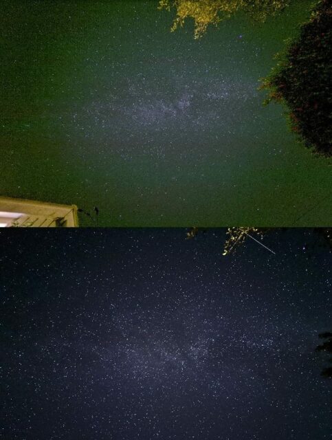 Astrofotografia con fotocamera ultra grandangolare (sopra) e fotocamera principale (sotto) del Pixel 5.