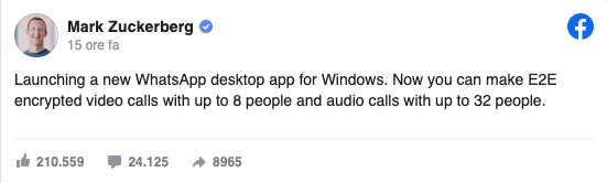 Adesso ci si chiede giustamente da quando sarà disponibile la nuova funzione di WhatsApp. Ebbene possiamo dire che l’aggiornamento che permette di realizzare le videocall è già disponibile per Windows. Oltretutto, per non farci mancare nulla, nel post pubblicato Mark Zurkerberg ha pensato bene di inserire il link per il download. I più si domandano se presto questa opzione arriverà anche su chi utilizza Mac, ma ancora non ci sono informazioni a riguardo. Si dovrà avere ancora un po’ di pazienza.