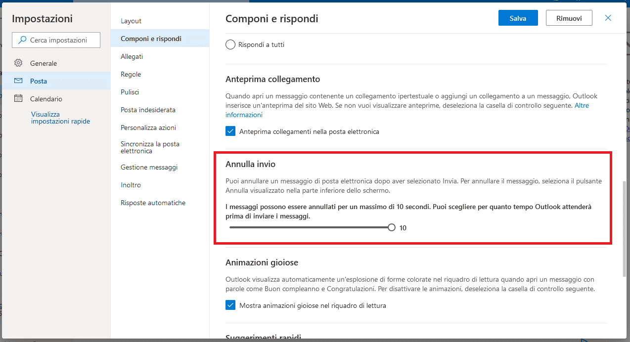Dalla finestra testé aperta occorre scegliere la voce Posta sulla colonna a sinistra, Componi e rispondi nella colonna centrale e quindi scorrere l’elenco delle diverse impostazioni fino a raggiungere la sezione Annulla invio. Da qui sarà possibile spostare uno slide che andrà a impostare il numero di secondi di attesa prima di inviare una mail (fino a un massimo di 10).
