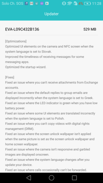 Il nuovo firmware per Huawei P9 risolve una serie di bug, tra cui il mancato download degli allegati con Exchange, la notifica via led della batteria in esaurimento, errata visualizzazione degli sfondi nel lock screen, problemi nell’inoltro delle chiamate, cambiamento per errore della lingua dopo un aggiornamento.