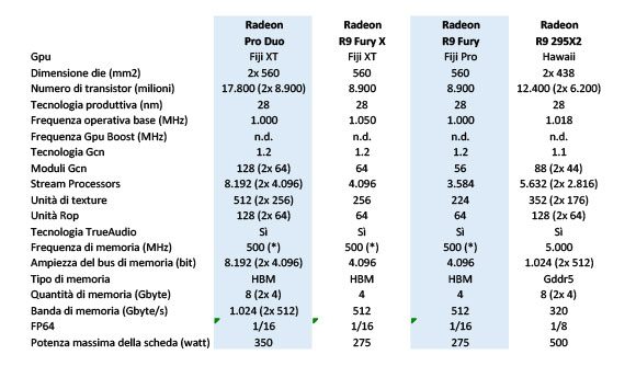 Le principali caratteristiche della Radeon Pro Duo a confronto con i modelli Radeon R9 Fury e con il precedente modello a doppia Gpu Radeon.