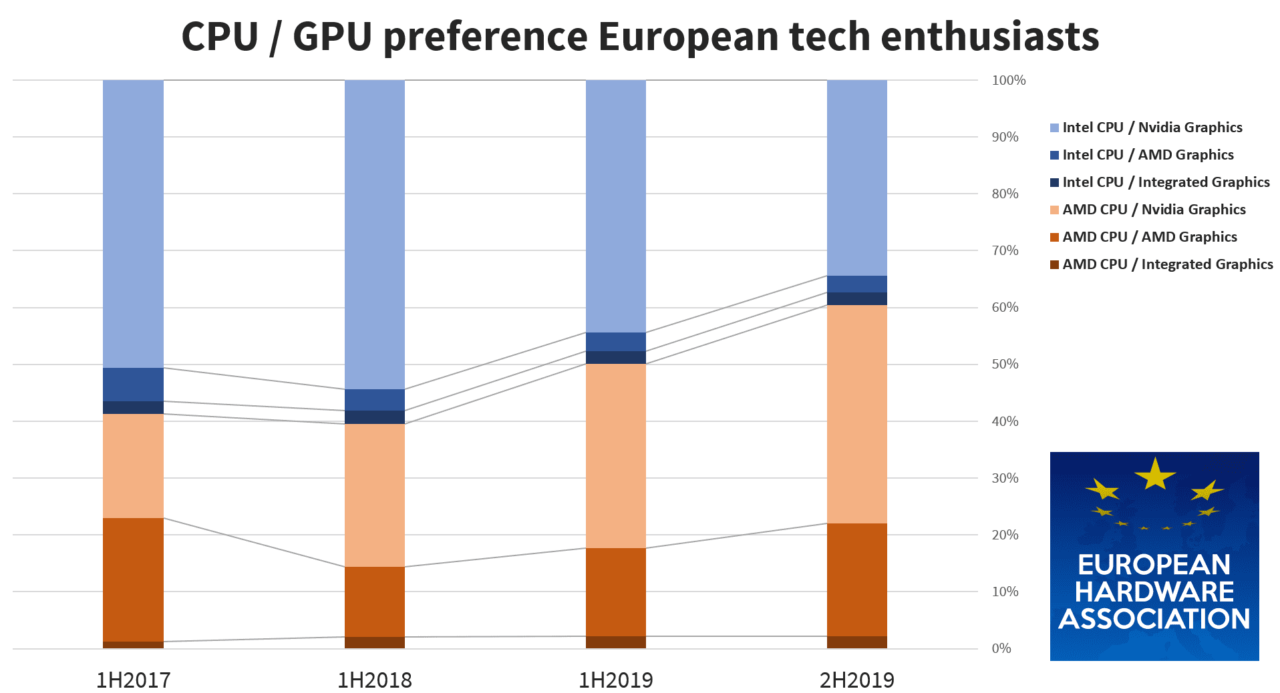 L’architettura Zen (e il recentemente svelato “sequel” Zen 2) rappresenta un successo a dir poco straordinario per AMD. Soprattutto in Europa, dove stando a una ricerca di European Hardware Association (EHA) il 60% degli utenti preferisce ormai le CPU “in rosso” rispetto a quelle di Chipzilla. Santa Clara continua invece a soffrire sul fronte delle GPU, dove NVIDIA la fa come al solito da padrona; chi acquista una CPU AMD, comunque, quasi sempre vi associa una GPU discreta Radeon.