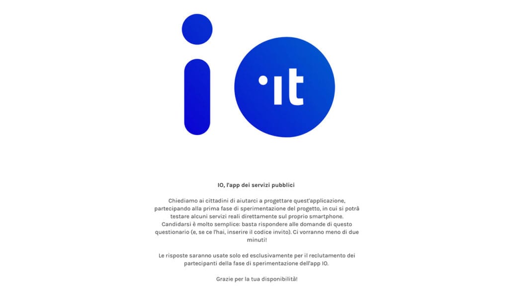 Matteo De Santi, Chief Product & Design Officer del Team per la Trasformazione Digitale della Presidenza del Consiglio dei Ministri spiega che “Dopo il test su un prototipo realizzato nell’estate 2018 e la demo condotta lo scorso novembre con un centinaio di stakeholder tra parlamentari ed esperti, sta per partire la sperimentazione dell’app IO in contesti reali. In linea con la natura open source del progetto, nelle prossime settimane migliaia di cittadini in tutta Italia saranno invitati a contribuire all’evoluzione di IO. Vogliamo testarne l’effettiva funzionalità, mettendo a fattor comune le competenze e l’esperienza diretta degli utenti finali; questo ci permetterà di realizzare un prodotto migliore sin dalla prima release della app, in arrivo negli store nella seconda metà del 2019”.