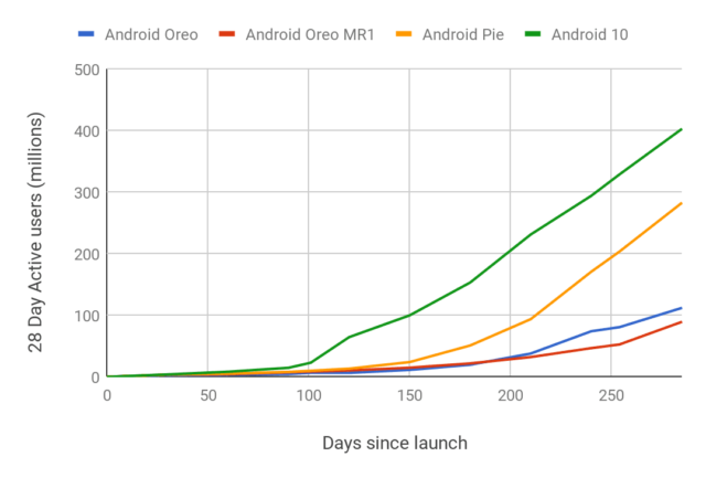 Il grafico evidenzia che Android 10 è installato su 400 milioni di dispositivi dopo 300 giorni dal lancio. Considerato che ci sono oltre 2,5 miliardi di dispositivi (secondo il dato fornito da Google lo scorso anno), la percentuale di Android 10 è circa il 16%.