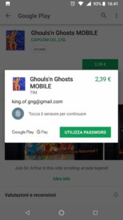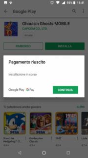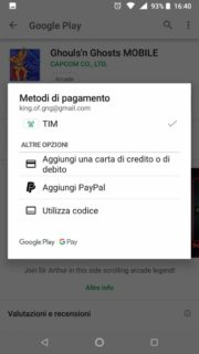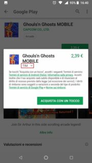 Usando come test una scheda SIM di TIM montata su uno smartphone con Android 8.1, la procedura per l’acquisto di una app a pagamento su Google Play – la conversione di un celebre arcade della golden age di Capcom nell’esempio in oggetto – è la seguente: dopo aver selezionato il pulsante verde con indicato il costo in Euro della app, toccare il pulsante Accetto per fornire le eventuali autorizzazioni di accesso necessarie alla app, quindi toccare Continua se è la prima volta che si effettua un acquisto su Play.