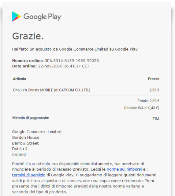 La ricevuta del pagamento arriverà via posta elettronica alla casella registrata sull’account di Google, una missiva che sarà opportuno conservare in archivio (magari su un client e-mail locale e non solo sul “cloud”) come riferimento per il futuro.