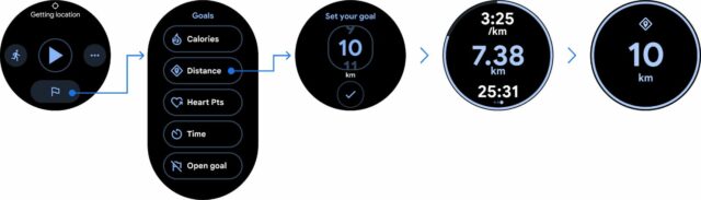 Un’altra schermata mostra il tempo parziale e un avviso per ogni chilometro. Un tocco sul quadrante con le calorie permette di visualizzare altre metriche, tra cui gli Heart Points (punti cardio). Dopo aver scelto il tipo di allenamento, l’utente può impostare un obiettivo per distanza, calorie, punti cardio, durata e altro.