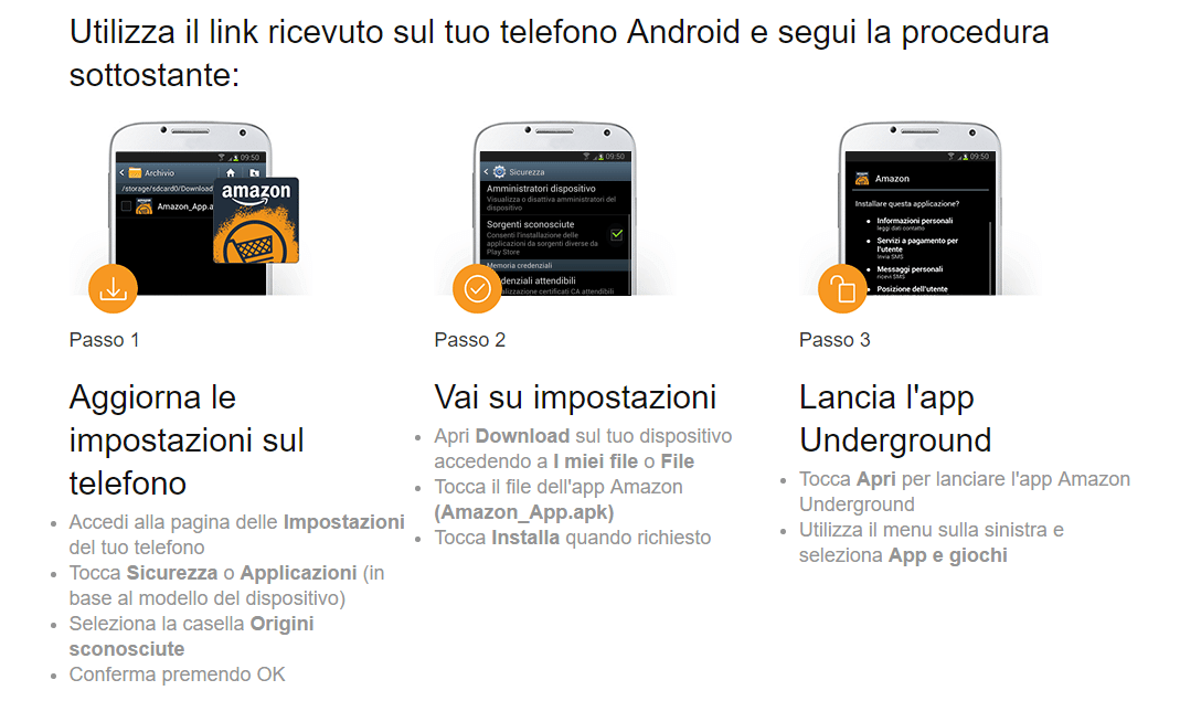 L’applicazione Amazon Underground è disponibile esclusivamente su Amazon.it, visitando dal dispositivo mobile il link https://www.amazon.it/underground e seguendo le istruzioni riportate sullo schermo