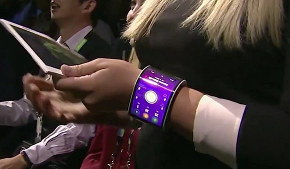 Infine, ma non meno importanti, ci sono i due prototipi con schermo flessibile. Il primo è uno smartphone con sistema di chiusura a scatto che può essere messo intorno al polso.