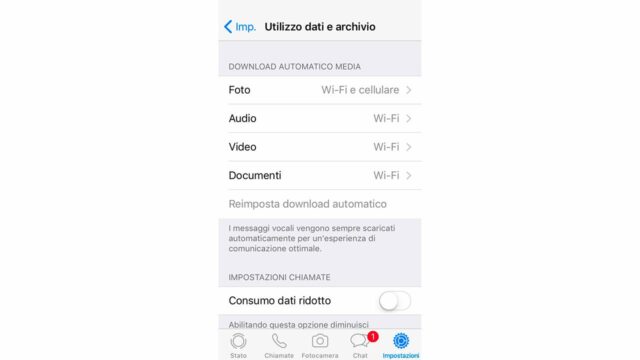 Di default il download automatico media prevede, per le Foto, il download automatico sotto rete cellulare e Wi-Fi, mentre per audio, video e documenti vengono scaricati automaticamente solo in presenza di una rete Wi-Fi. I messaggi vocali non rientrano nella categoria “audio” e vengono sempre scaricati automaticamente, indipendente da queste impostazioni.