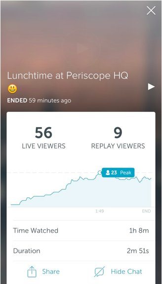 Più seria, almeno nell’aspetto, è la nuova funzione di Periscope che permette di avere maggiori dati sulla visualizzazione delle proprie Live. Una finestra con i dati statistici riporta ora il numero di accessi, compresi quelle delle repliche (se si decide di lasciare accessibile succesivamente la propria trasmissione).
