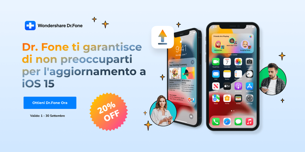 Dal 1 al 30 settembre, inoltre, la suite Dr.Fone specifica per il recupero dati di iOS e per la risoluzione dei problemi legati all’aggiornamento a iOS 15 è in sconto del 20%, è possibile assicurarsi il programma più completo ed efficiente esistente sul mercato per la gestione e il recupero dei propri dati. Per maggiori informazioni, visitate il sito ufficiale: https://drfone.wondershare.it/ios15-update-problems.html