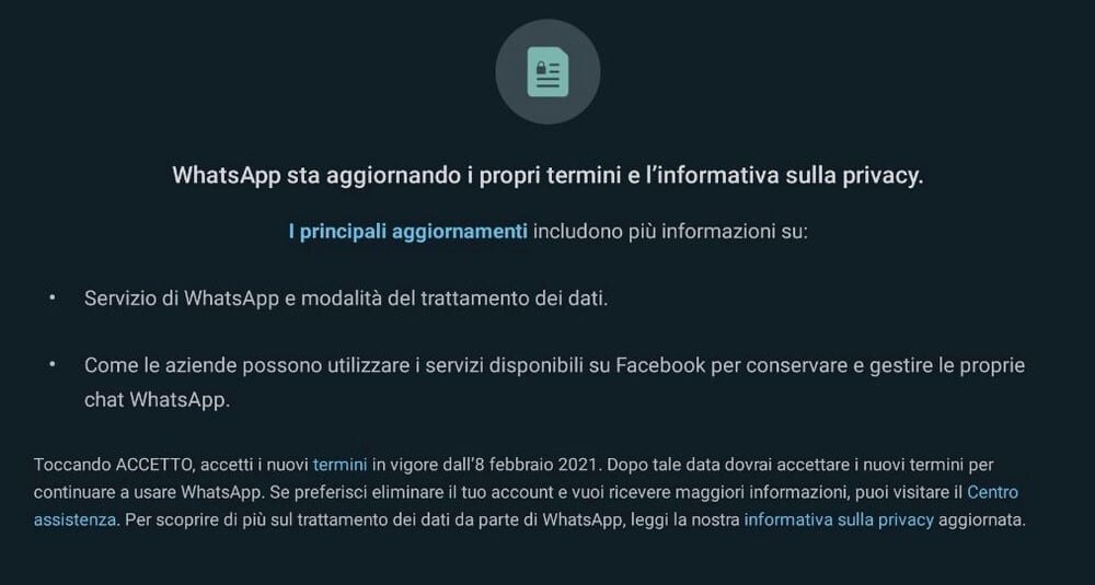 Toccando ACCETTO, accetti i nuovi termini e l’informativa sulla privacy, che entreranno in vigore l’8 febbraio 2021. Dopo questa data, dovrai accettare questi aggiornamenti per continuare a utilizzare WhatsApp. Puoi anche visitare il Centro assistenza se preferisci eliminare il tuo account e desideri ulteriori informazioni”.