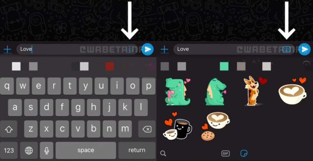 La funzione analizzerà la prima parola inserita nella barra di digitazione della chat e, se questa corrisponde a qualsiasi adesivo salvato nella libreria, verrà mostrato un suggerimento. Ma ecco un esempio del suggerimento degli adesivi su WhatsApp con la parola “Love”, ovvero “amore”.