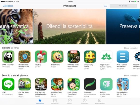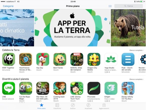 In attesa del 22 aprile, data nella quale ogni anno si celebra la Giornata della Terra (in inglese Earth Day) l’App Store di Apple si è già vestito di verde. Fino al 24 aprile il 100% dei proventi delle app e degli acquisti In-App che partecipano all’iniziativa andranno a sostegno del lavoro globale del WWF (World Wide Fund For Nature) per la salvaguardia del pianeta.
