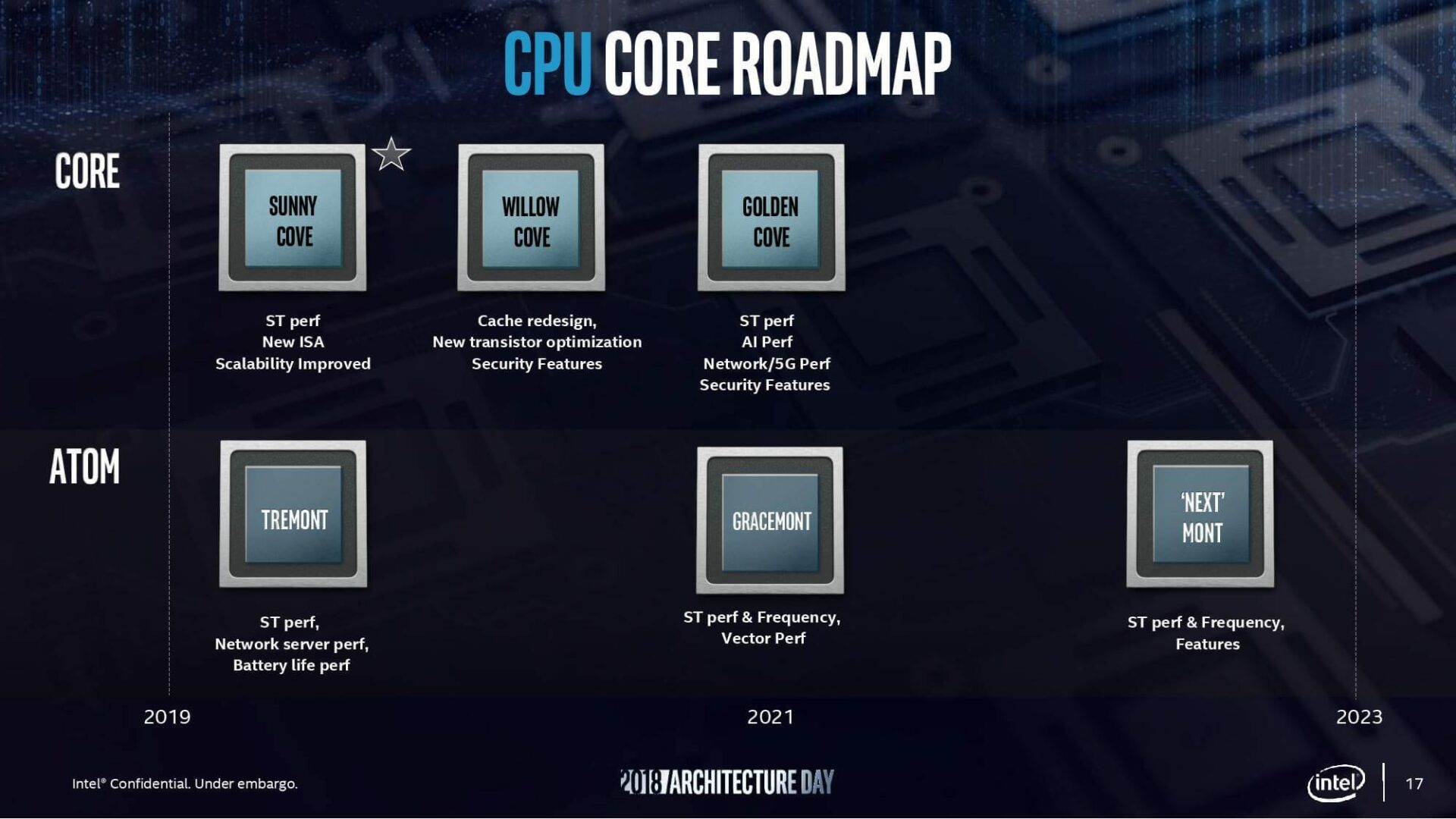 La nuova architettura includerà nuove istruzioni (AVX-512) in grado di accelerare le operazioni vettoriali con le reti neurali, la crittografia, la compressione e altri scenari di utilizzo, espanderà del 50% la dimensione della cache di primo e secondo livello, includerà nuove ottimizzazioni per aumentare il numero di istruzioni eseguibili in parallelo.