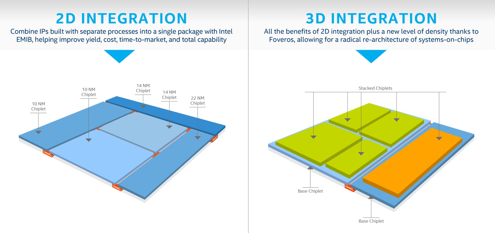 I primi prodotti Foveros includeranno ad esempio un “chiplet” a 10nm ad alte performance combinato con un die base a basso consumo da 22FFL. Secondo i critici, lo stacking 3D di Foveros rappresenta la risposta di Intel alle difficoltà sperimentate in questi anni col passaggio al processo produttivo a 10nm “puri”.