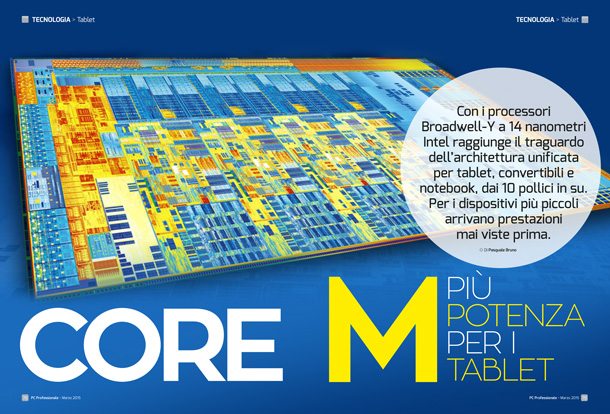 Annunciati a fine 2014, i processori Core M hanno fatto da apripista alla tecnologia a 14 nanometri. Nota con il nome in codice Broadwell-Y, l’architettura alla base del Core M si dimostra un traguardo importante per Intel perché rappresenta l’unificazione, a livello tecnologico, tra le soluzioni per tablet, notebook e Pc all in one. Il core di un processore Core M è lo stesso di un Core i7 di un notebook; esistono naturalmente differenze a livello prestazionale, ma la base di partenza è comune. Proprio in merito alle prestazioni, il Core M si posiziona tra gli Atom e il Core i3/i5; lo scopo di Intel è quello di fornire una soluzione per tablet e convertibili con schermo compreso tra 10 e 13 pollici e spessore inferiore a 10 millimetri.