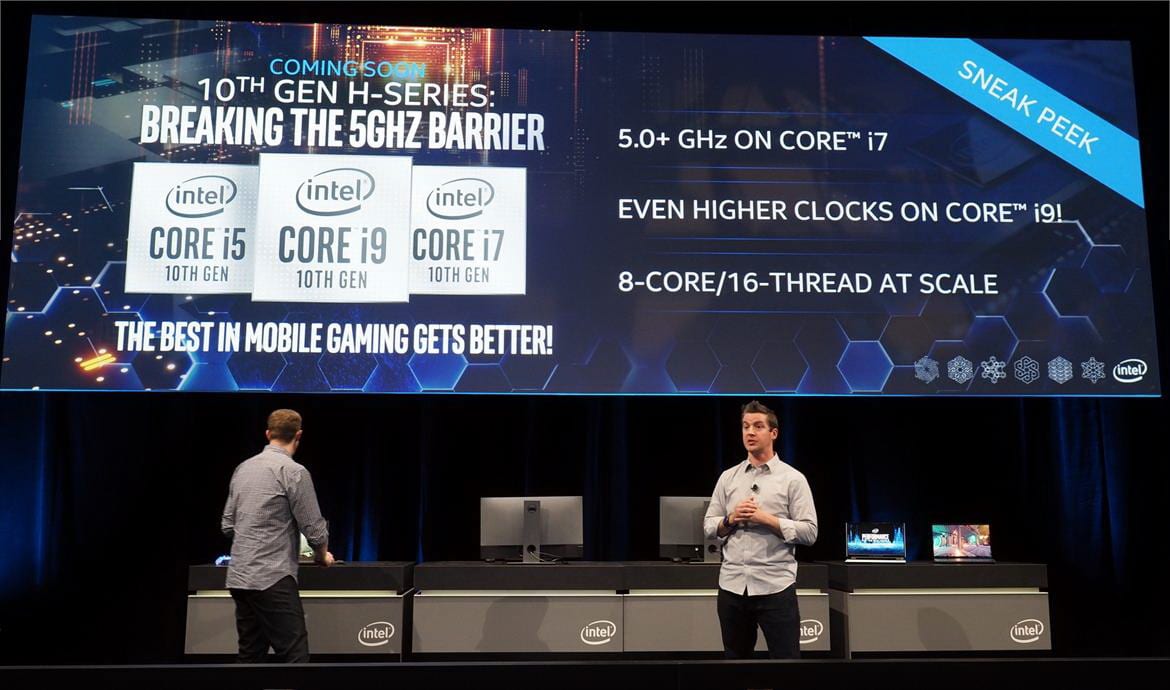 Al CES 2020 Intel ha insomma fornito un assaggio delle capacità di Comet Lake-H, CPU mobile di fascia alta caratterizzati da un TDP di 45W e ancora “stampate” tramite un processo produttivo a 14 nanometri evoluto (che Intel chiama 14nm++). I chip Comet Lake-H saranno disponibili in configurazioni fino a 8 core fisici e 16 thread logici, con frequenze di funzionamento in Turbo fino a 5GHz e oltre (per le CPU Core i7) e con clock “persino più alti” per i Core i9.