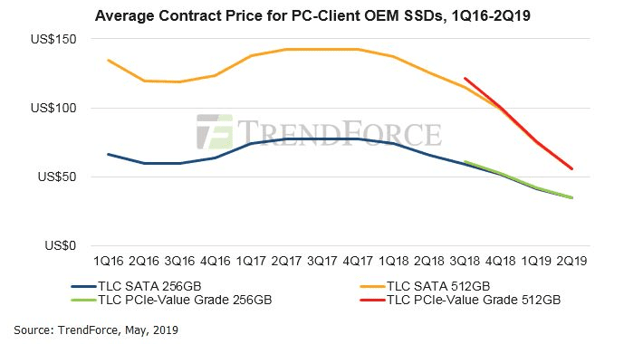 Il costo di 0,10 dollari per gigabyte alla fine del 2019 riguarda in particolare gli SSD da 512GB e 1TB, sostiene DRAMeXchange, con il primo modello destinato a prendere il posto dell’offerta “standard” di storage integrato sui PC OEM accanto agli ancor più convenienti modelli da 256GB. In forte crescita anche la popolarità dei dischi che usano una connessione PCIe (NVMe), visto che il prezzo è sostanzialmente identico alla corrispondente offerta su porta SATA.