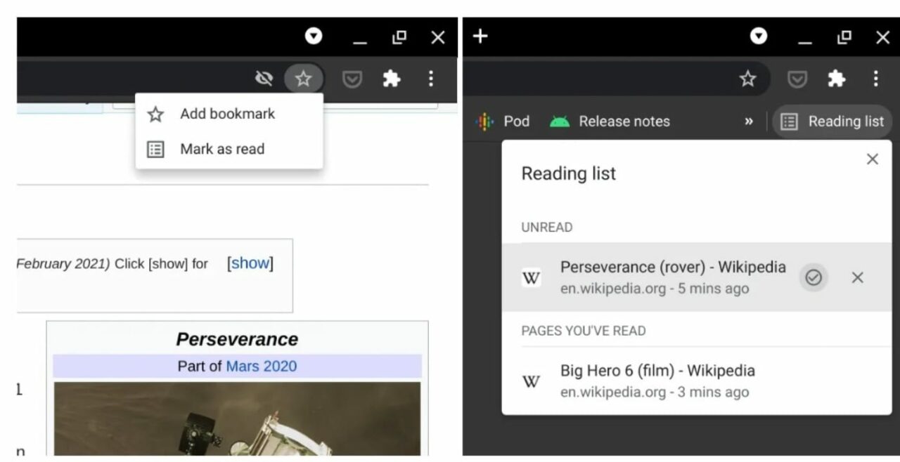 Tra le altre novità in arrivo, Chrome 89 aggiungerà anche un nuovo elenco di lettura. Questo sarà accessibile toccando l’icona a forma di stella nella barra degli indirizzi. In alternativa si potrà visualizzare come cartella nella barra dei preferiti, all’apertura di una scheda nuova. Oltre a Aggiungi segnalibro, diventa quindi disponibile una nuova opzione, ovvero Aggiungi a elenco di lettura. Nella barra dei segnalibri verrà anche visualizzata la cartella Elenco di lettura. Questa si dividerà in “Non letto” e “Pagine lette”, con la possibilità di selezionare “Segna come letto” o “Elimina”.