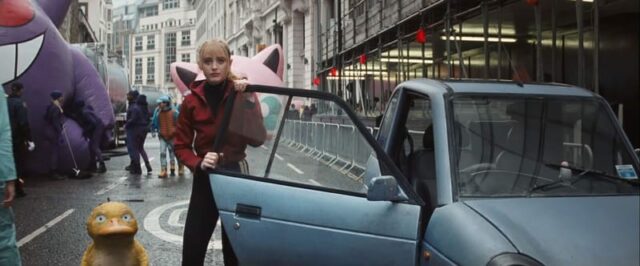 Sullo sfondo si possono vedere due palloncini giganti di Gengar e Jigglypuff, come se qualcuno li stesse preparando per una parata.