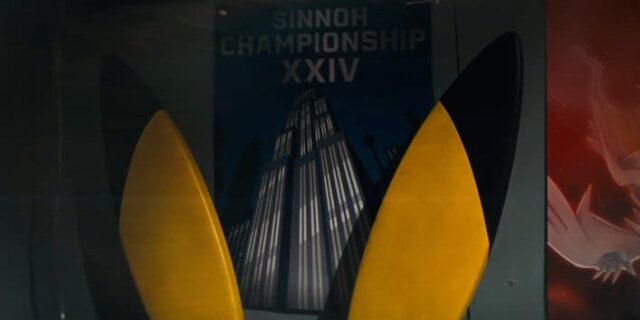 Campionato Sinnoh Una pubblicità del ventiquattresimo campionato di Sinnoh e un cartonato delle orecchie di Pikachu.