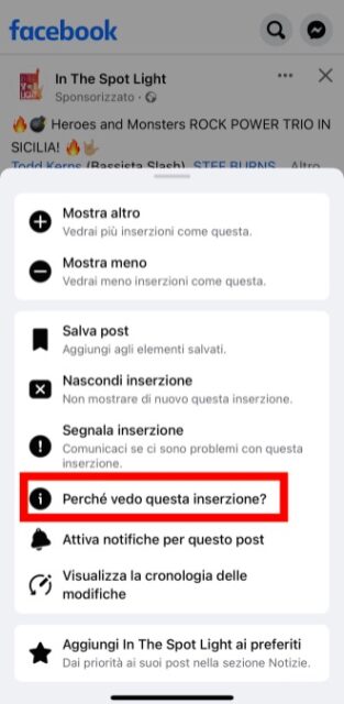 Se sentite la necessità di vedere la sezione di cui vi abbiamo parlato su Facebook, ovvero “Perché vedo questa inserzione”, vi basterà toccare i tre puntini in alto a destra nel post sponsorizzato.