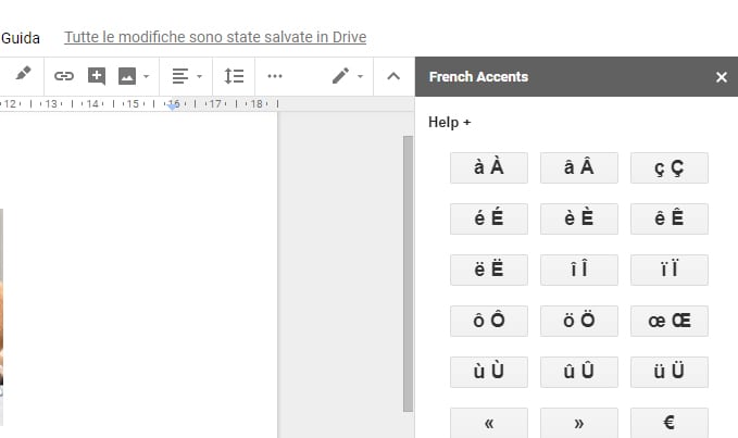 Vi trovate a scrivere un testo in una lingua che non è l’italiano e avete bisogno di particolari simboli e segni grafici? Niente paura! Google Docs mette a disposizione un add-on che fa al caso vostro. Andate su COMPONENTI AGGIUNTIVI e poi su INSTALLA COMPONENTI AGGIUNTIVI. Nella finestra che vi si apre cercate “Easy Accents” e clicchiamo su GRATIS. Una volta installato, cliccate su Componenti aggiuntivi e su Easy Accents. Una finestra si aprirà sulla destra del vostro documento e dopo aver scelto la lingua avrete a disposizione tutti i vostri simboli grafici necessari.