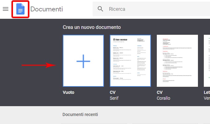 Per scegliere i template dovete arrivare alla schermata principale di Google Documenti, che potete raggiungere cliccando sull’icona del file blu che trovate in alto a sinistra. Da qui troverete una prima barra scura con al suo interno diversi template: è la Galleria Modelli, che metterà a vostra disposizione tantissimi documenti già preimpostati, pronti da modificare!