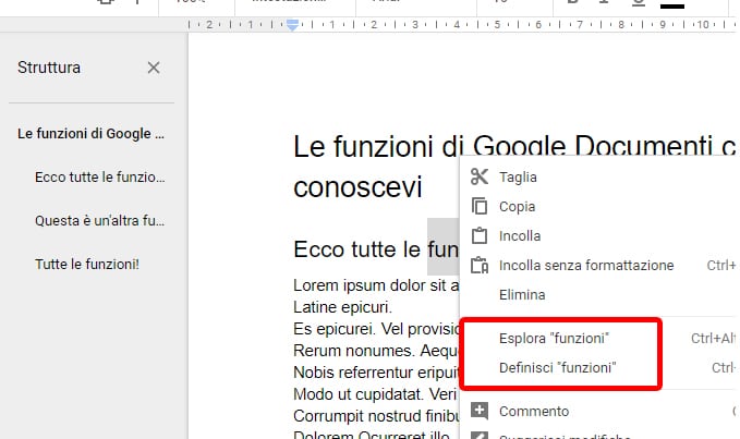 Due funzioni estremamente interessanti sono il dizionario e la funzione esplora. Entrambe possono tornare utili sia nella stesura che nella revisione dei documenti. Per utilizzarle vi basterà selezionare il termine di interesse e cliccare con il tasto destro su di esso. Vi si aprirà il classico menu con le varie funzionalità e al centro troverete Esplora e Definisci.