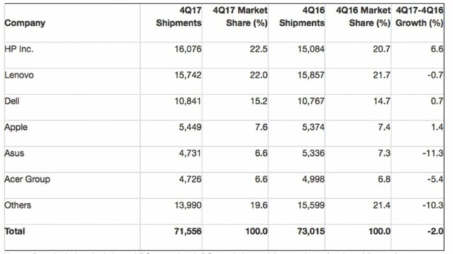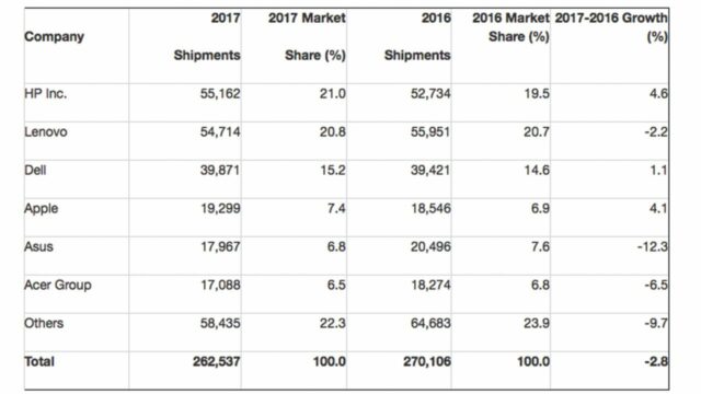 Dopo l’ottimismo alimentato dai dati IDC, che mostravano un mercato Pc in lieve ripresa a fine 2017 (ne abbiamo parlato qui), questa analisi di mercato di Gartner smorza l’entusiasmo, mostrando al contrario un forte calo nelle vendite dell’ultimo trimestre del 2017, che scendono del 2% rispetto allo stesso periodo del 2016, per un -2,8% annuo. È il tredicesimo trimestre consecutivo chiuso in rosso, che corona il sesto anno di calo per l’industria dei computer.