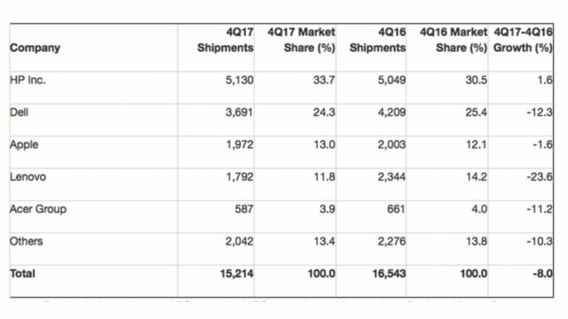 Nell’ultimo trimestre del 2017 le vendite dei Pc negli Stati Uniti sono crollate verticalmente, con la sola HP in positivo.
