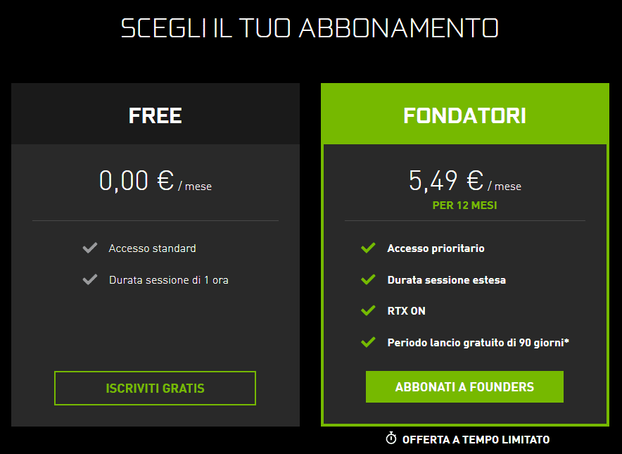 L’offerta GeForce NOW prevede infatti un abbonamento “base” gratuito, con l’accesso “standard” ai server cloud di NVIDIA e una singola sessione di gioco dalla durata massima di un’ora. Pagando €5,49 al mese per 12 mesi, invece, si avrà diritto all’accesso “prioritario” ai server, a una sessione di gioco molto più duratura e all’attivazione della grafica in ray tracing (RTX). Quest’ultima offerta ha una durata limitata di 90 giorni.