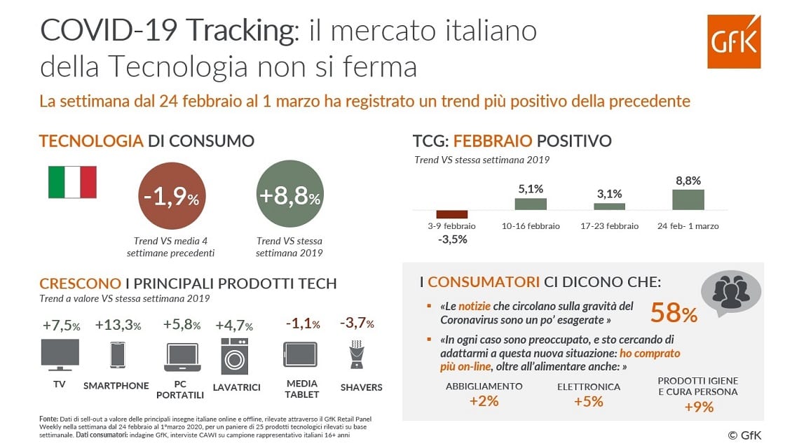 Visto il nuovo regime di comportamento imposto alla popolazione, è a questo punto facile prevedere che l’e-commerce sperimenti una nuova impennata (ritardi nelle consegne di Amazon permettendo) anche nelle prossime settimane. Per il mese di febbraio, GfK prevede un dato in crescita per il mercato hi-tech (online e non solo) rispetto allo scorso anno.