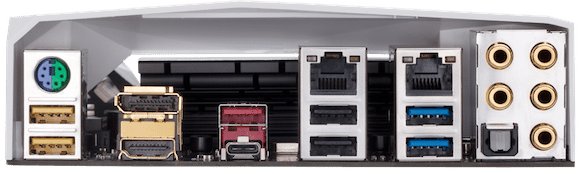 Il pannello posteriore fornisce accesso alle uscite video – Displayport e Hdmi – per la grafica integrata del processore, alle porte Usb 3.1, a quelle Usb 3.0, alle connessioni di rete e a quelle per l’audio in formato analogico e digitale.