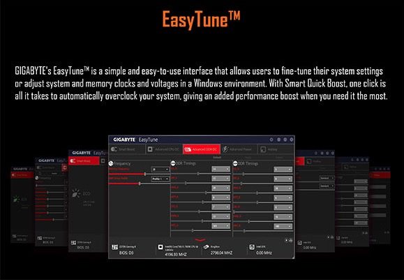 Per facilitare le operazioni di overclock Gigabyte mette a disposizione dell’utente l’interfaccia EasyTune che permette di lavorare sui parametri operativi della scheda madre e dei componenti installati attraverso un’interfaccia grafica intuitiva e che facile utilizzo.
