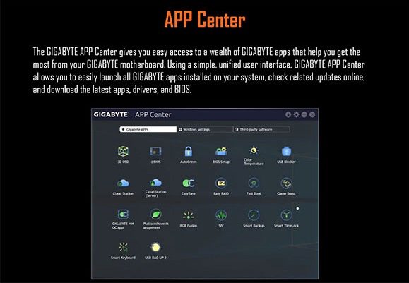Tra le varie carattersitiche di questa piattaforma citiamo inoltre il supporto all’App Center di Gigabyte: si tratta di una console che consente di visualizzare e accedere alle diverse applicazioni di controllo supportate dalla piattaforma.