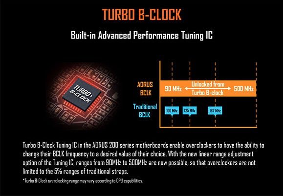 Trattandosi di un prodotto destinato a un pubblico di utenti evoluti, la Z270X Gaming 5 implementa soluzioni avanzate per l’overclock attraverso un chip (Turbo B-Clock) che permette di controllare in modo preciso e lineare la frequenza base del bus del processore. Rispetto alle soluzioni tradizionali, il chip dedicato permette di variare la frequenza di base con passi di un 1 MHz all’interno di un intervallo che spazia tra i 90 e i 500 MHz. Tutto ciò, se abbinato con un processore dotato di moltiplicatori sbloccati come quelli Intel della serie K, permette di sperimentare con la più ampia libertà le impostazioni di overclock del sistema.