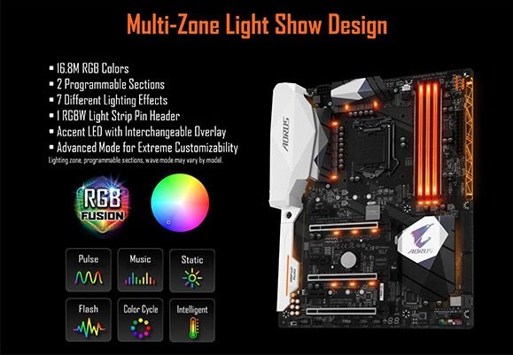 In questa immagini si può osservare il nuovo sistema di illuminazione RGB Fusion Led presente sulla scheda Gigabyte Aorus Z270X Gaming 5.
