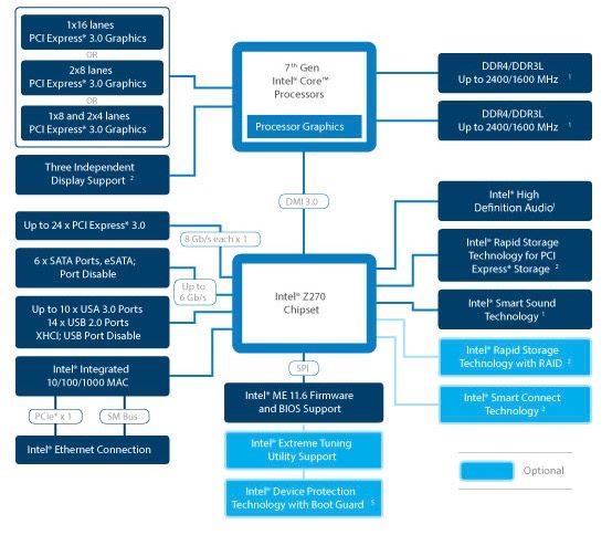Il chipset Intel Z270 è costituito da un unico elemento che funge da snodo centrale tra il processore e il resto del sistema attraverso il bus di comunicazione Dmi (Direct Media Interface) 3.0. Il Pch (Platform Controller Hub) Z270 dispone di 24 linee Pci Express 3.0 che si sommano alle 16 gestite in modo diretto dal processore e la cui frequenza risulta indipendente da quella selezionata per il processore così da permettere overclock più stabili. Il chipset supporta fino a un massimo di dieci porte Usb 3.0 e nel complesso un massimo di 14 porte tra Usb 3.0 e Usb 2.0.