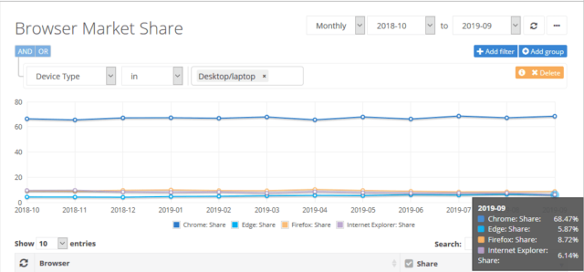 Aggiornate a settembre 2019, le stime NetMarketShare sui browser Web più usati su PC concedono ai software di navigazione Microsoft appena il 12% del mercato totale con un -1,8% rispetto al mese precedente. Internet Explorer perde l’1,4% di utenza e mantiene il 6,1% del mercato, un record negativo mai raggiunto prima.