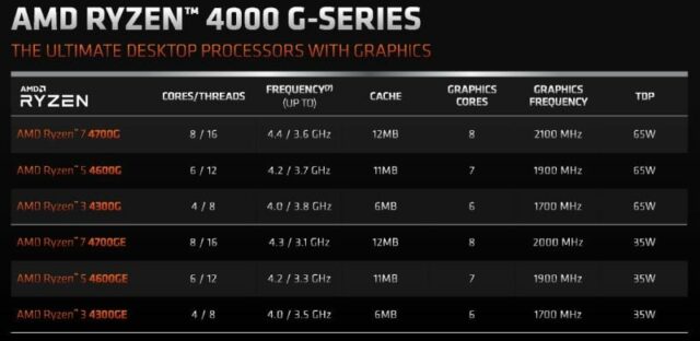 I Ryzen 4000G sono basati sull’architettura Zen 2 a 7 nanometri e utilizzano ancora il socket AM4. Sono quindi la versione desktop dei Ryzen 4000 Mobile, ma con frequenze e TDP superiori. La serie comprende sei modelli che si differenziano in base al numero di core/thread, alla frequenza di clock (base e turbo), oltre che in base al numero di core e alla frequenza della GPU. Le varianti GE hanno un TDP inferiore (35 watt contro 65 Watt).