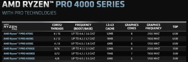 Questi sono invece i sei modelli Ryzen Pro 4000G. L’unica differenza è rappresentata dal supporto per varie tecnologie business, tra cui la crittografia delle memoria.